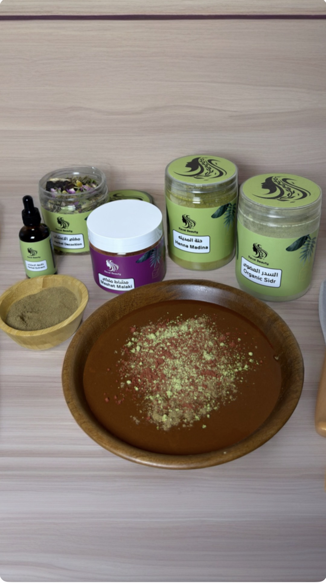 خلطه بين الحنه والسدر والمشاط للعنايه بالشعر والتكثيف السريع .