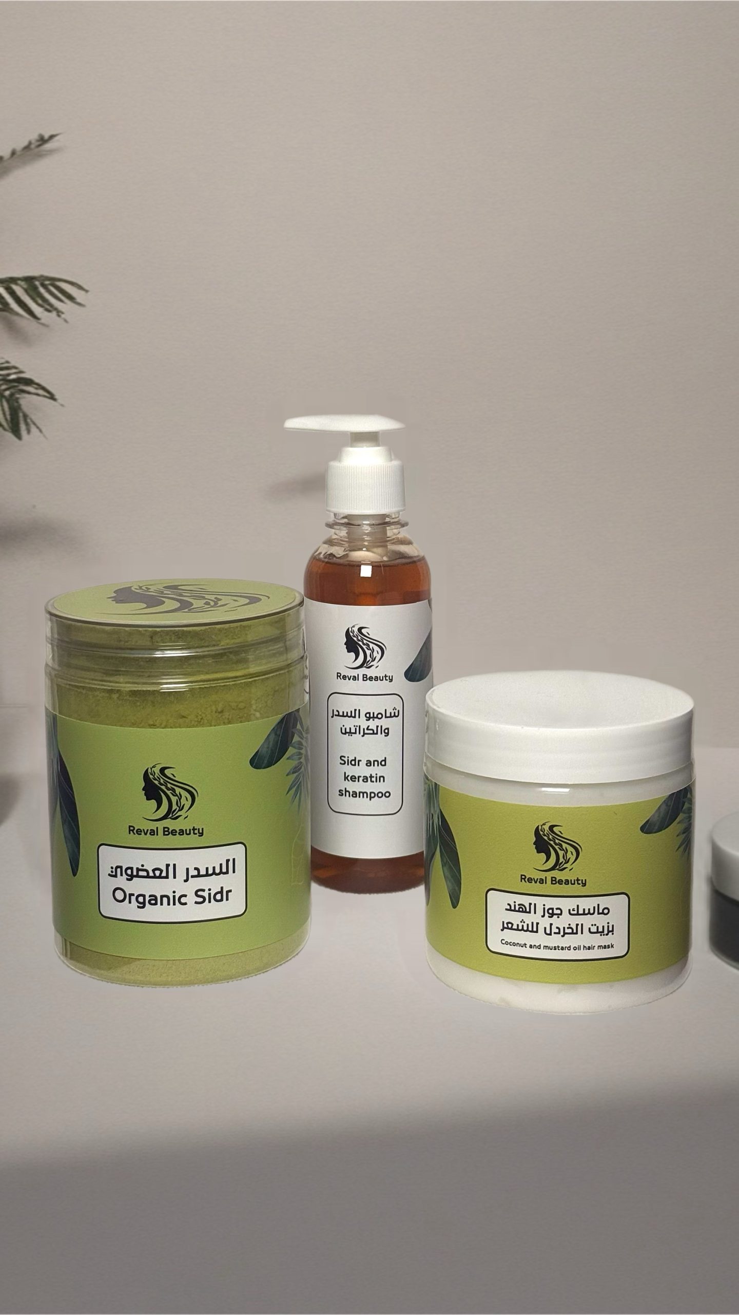 المجموعه عباره عن سدر بودر وشامبو السدر الطبيعي مع الكراتين الطبيعي لعلاج الشعر وماسك الشعر بجوز الهند وزيت الخردل .
